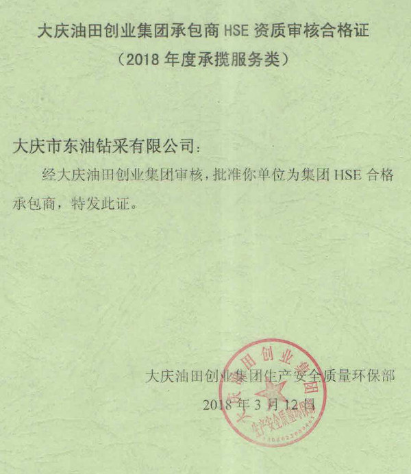 圖片新聞:大慶油田創(chuàng)業(yè)集團承包商HSE資質審核合格證(2018年度承攬服務類)
